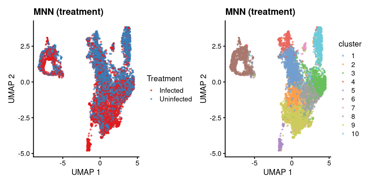 table(cluster = sce$cluster, treatment = sce$Treatment)
