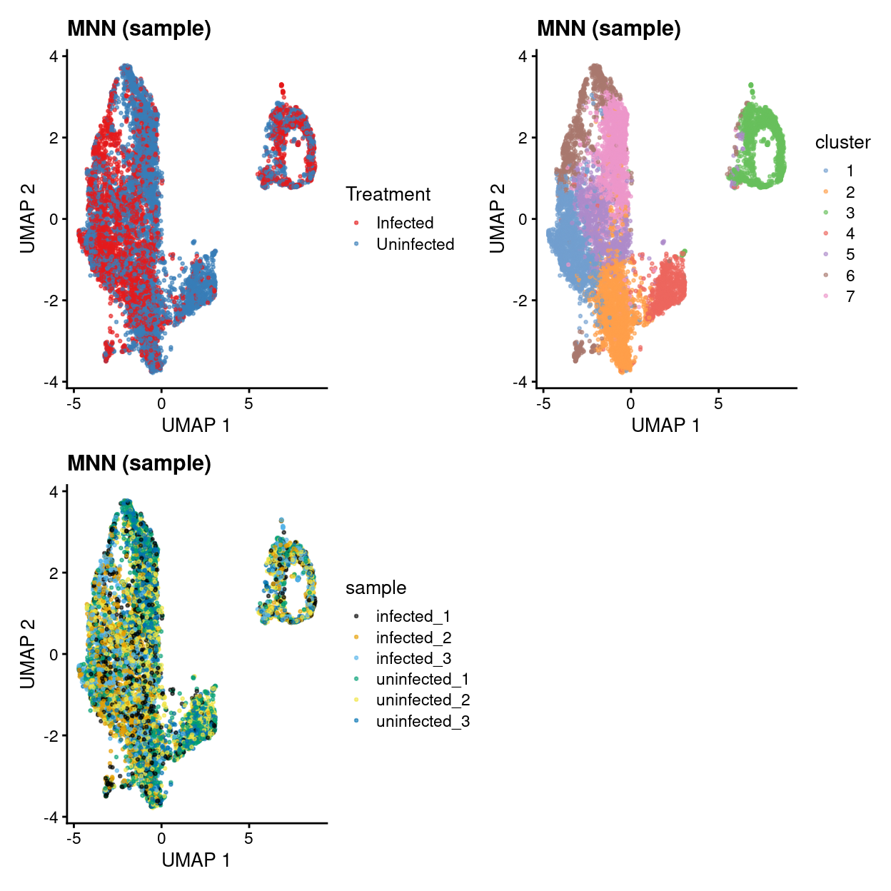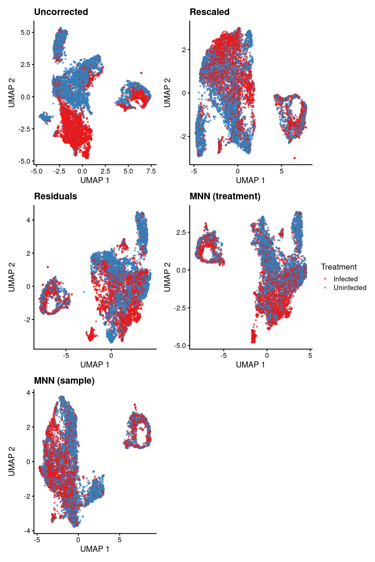 uncorrected.p1 <- plotUMAP(sce, colour_by = "Treatment", point_size = 0.5) +