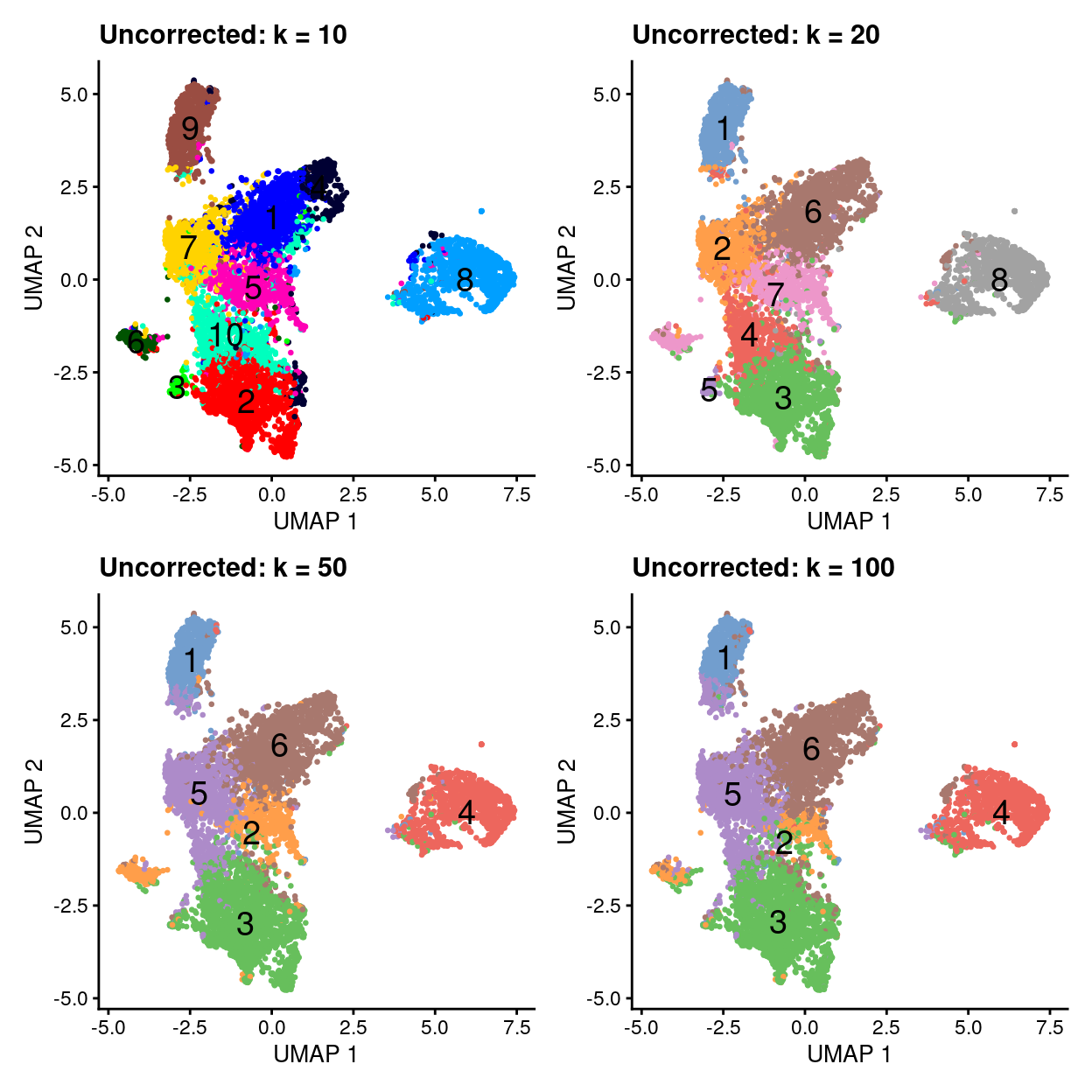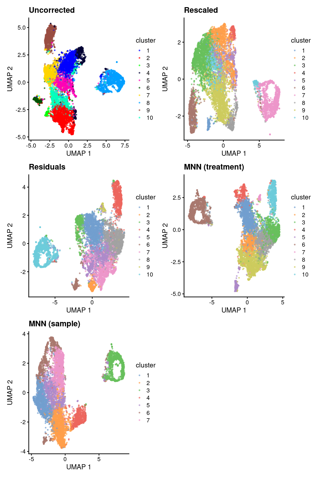 uncorrected.p2 <- plotUMAP(sce, colour_by = "cluster", point_size = 0.5) +